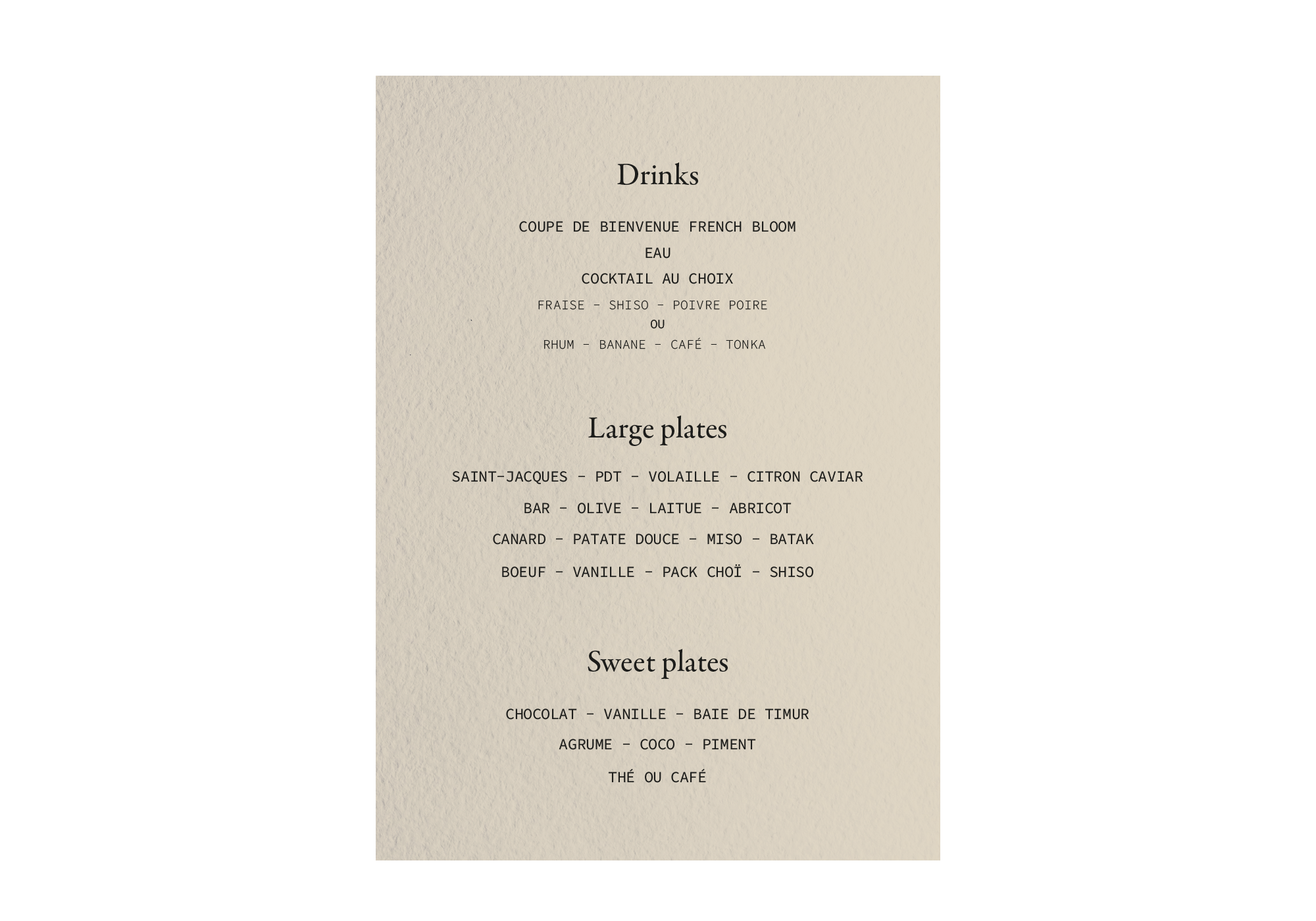 Un menu imposé, du cocktail au dessert : 6 temps. Gourmand, fruité, épicé, herbacé.